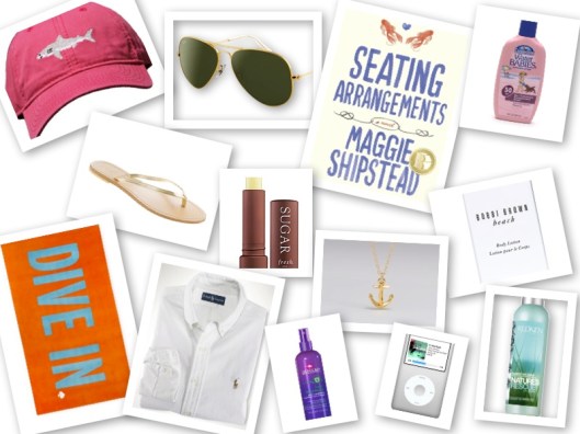1. a hat to protect you from the sun 2. some great shades 3. a fun beach read 4. full coverage sunscreen 5. metallic thin strapped flip flops (reduces tan lines!) 6. lip balm with spf 7. a delicate necklace 8. moisturizing body lotion 9. a colorful beach towel 10. casual, but cute coverup 11. something to tame the mane 12. my summer playlist 13. a spray to get those beachy waves