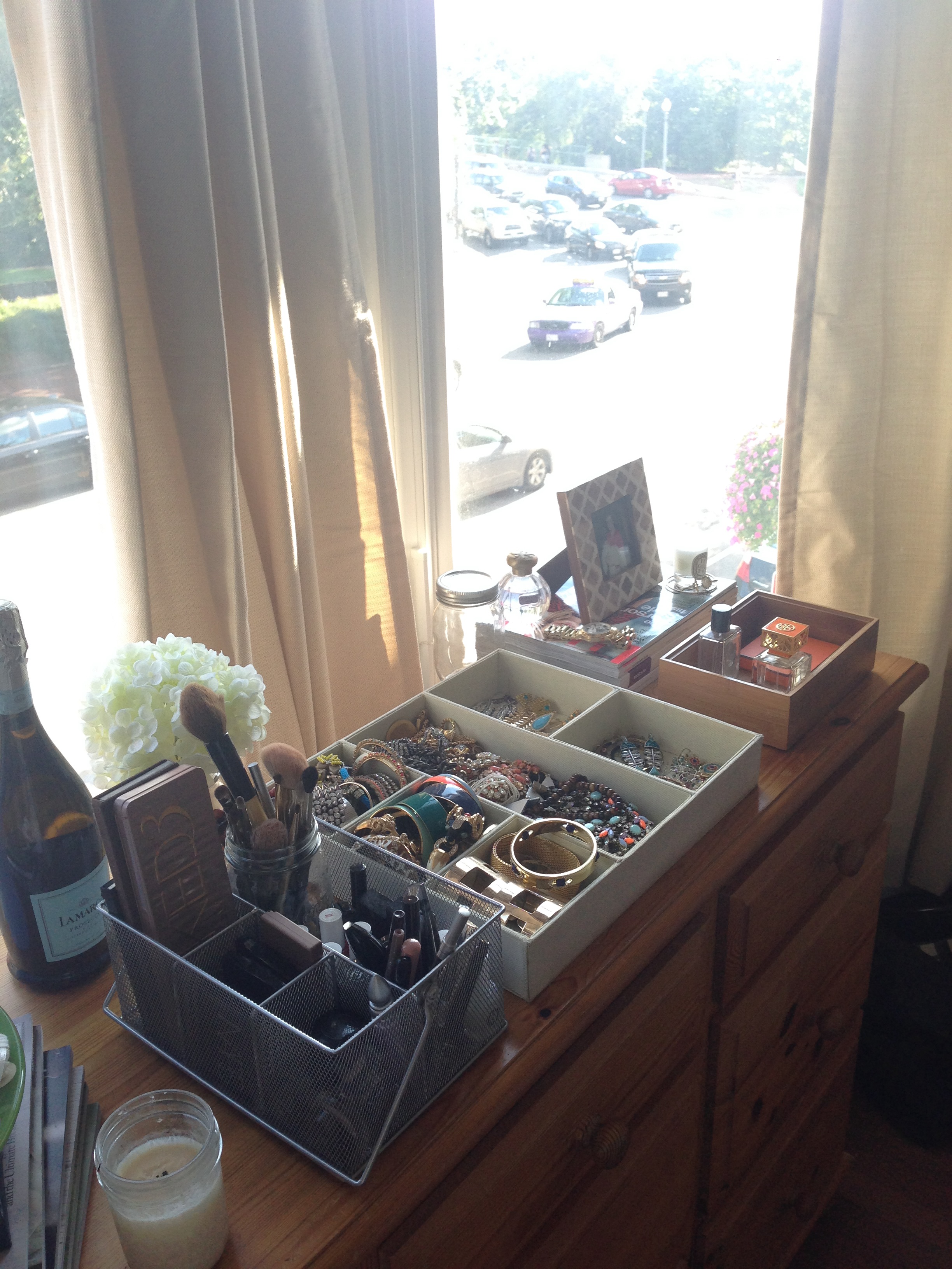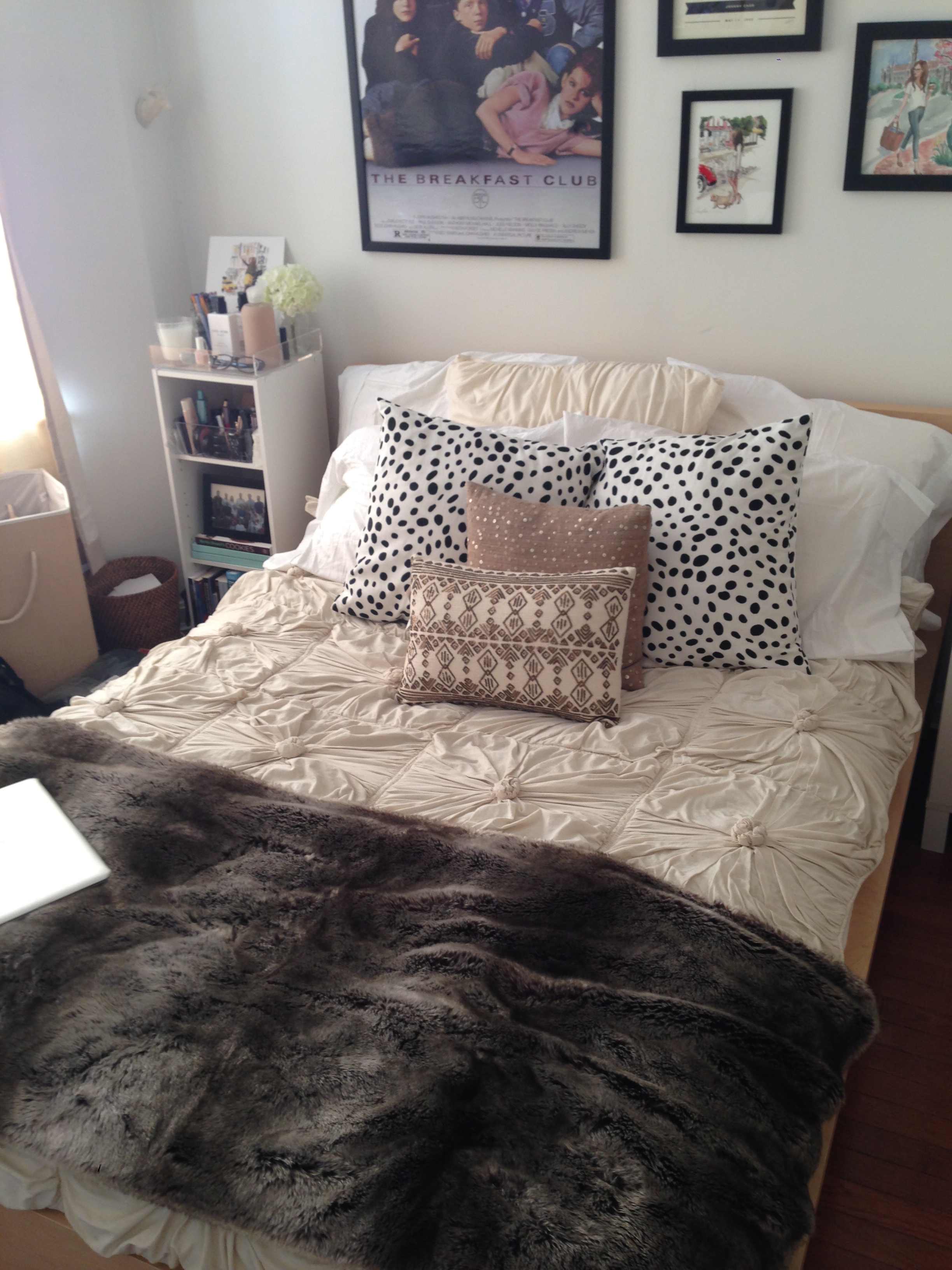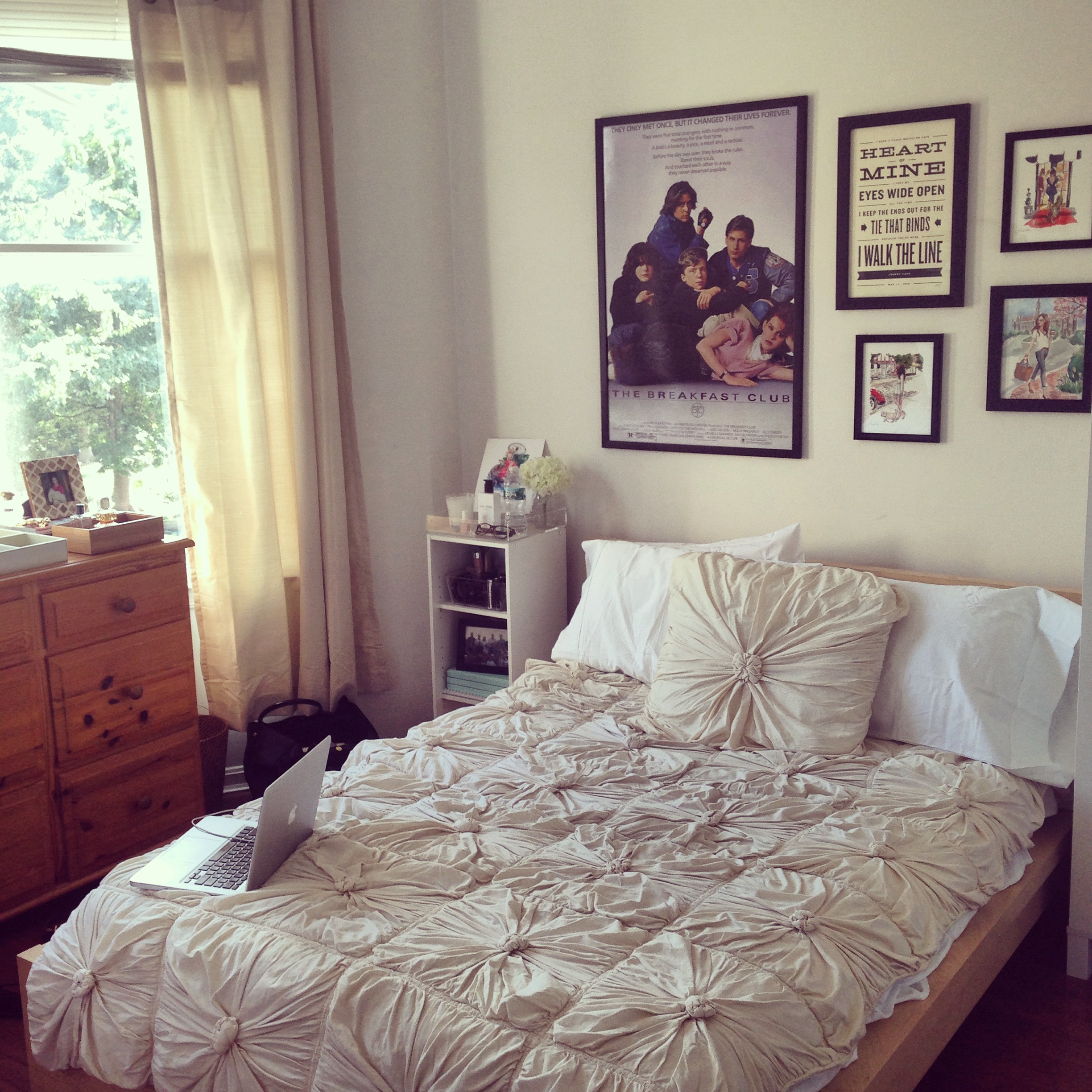 if you can’t tell already, that photo above is my bed. my comfy bed (pre-pillows and throw blanket) that gets destroyed every night when i go to sleep. i really don’t know what happens once i fall asleep, but blankets end up on the ground, pillows cover my face… basically, i’m a crazy sleeper plus i sleep really late, so it’s just a great combination all around. i do love decorating though, and this love has also applied to all my college bedrooms. my roommate and i both love our senior year bedroom, and as we phrase it, “it’s got the vibes.” my side’s got some of my favorites featured in wall art: the breakfast club, inslee, and johnny cash. three very important things. the little shelving unit next to my bed cost $30 and was really easy to set up (except for the fact i didn’t have half the tools to do it); it’s perfect for holding my school books and random books i’m reading, my notebooks, photos, makeup, and the tray. the tray is italicized, because it’s special to me. i keep my glasses, water bottle, favorite candle, lotions, my inslee calendar and pens and pencils up there… all the basics. last, but not least i use the top of my dresser for more makeup storage, jewelry and some other little “organizational displays.”