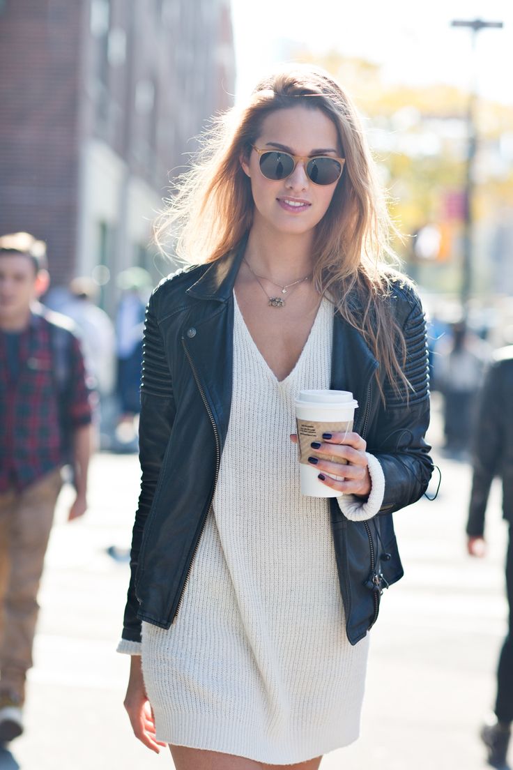 once i find something that i like i stick with it and wear it way too much. this time i’m not being dramatic when i say i’ll wear some variation of it throughout the week. flannels? check. thermals? check. sweaters? check. boots? check. i could go on, but i think you get the picture. at this point though, i think there’s something good about knowing what works for me, especially when i’m struggling to find something to wear. a white thick v-neck sweater, leather jacket, jeans and suede boots is one of my favorite looks. i might have just rolled out of bed, but hopefully you can’t tell… especially since i’m probably crying on the inside because all i want to do is go back to sleep.